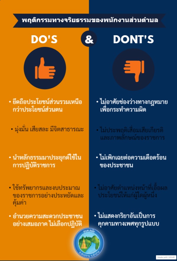 รายละเอียด : แนวปฏิบัติ Dos & Don’ts ของบุคลากรในสังกัดองค์การบริหารส่วนตำบลสมัย ตามประมวลจริยธรรม และแนวทางการส่งเสริมจริยธรรมและรูปแบบการขับเคลื่อนงานด้านการส่งเสริมจริยธรรมสำหรับเจ้าหน้าที่รัฐ เพื่อใช้เป็นแนวทางการปฏิบัติตนของบุคลากร และเป็นกรอบแนวทางการปฏิบัติที่ควรกระทำ และไม่ควรกระทำ ซึ่งจะช่วยให้บุคลากรมีการประพฤติปฏิบัติตนอย่างมีคุณธรรม และรักษาจริยธรรมอย่างเคร่งครัดอยู่เสมอ จัดทำโดย องค์การบริหารส่วนตำบลสมัย